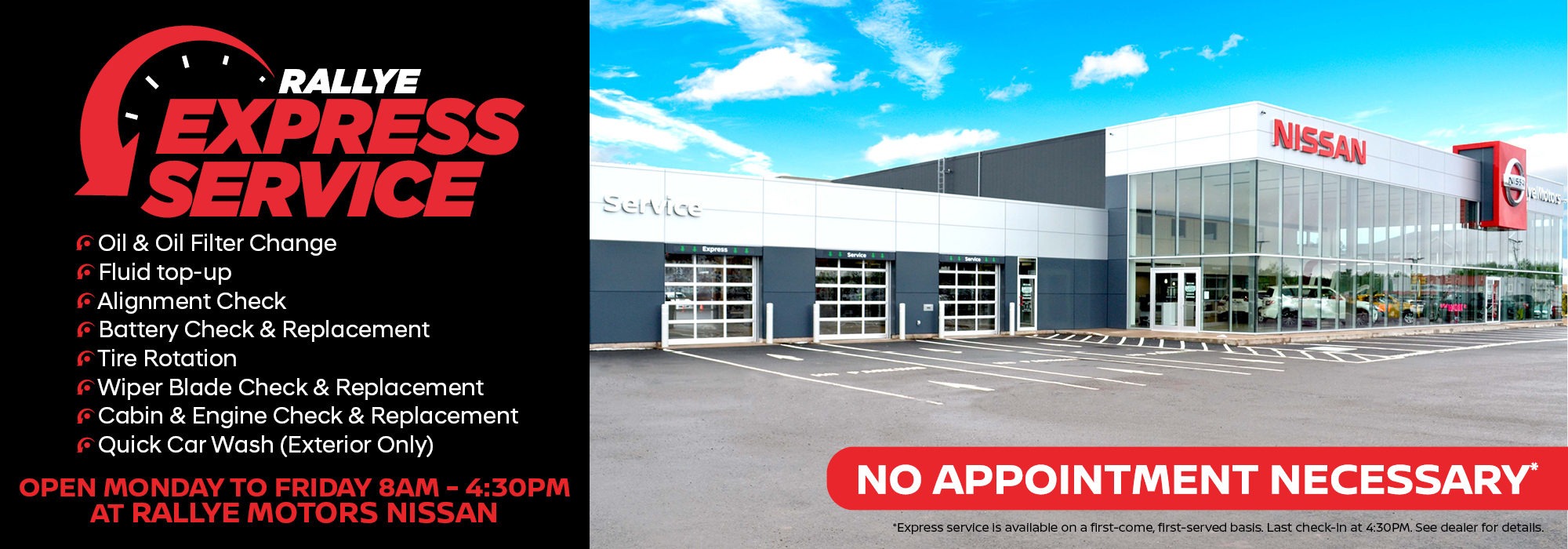 At Rallye Nissan, we know your time matters. That’s why we’ve launched our brand-new Express Service designed to keep your vehicle in top shape without delays or hassle.